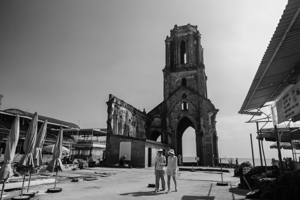 The Church of the Sacred Heart of Jesus (Xuong Dien Parish), commonly known as the Hai Ly Fallen Church, was built in 1943 but abandoned in 1996 due to coastal erosion. What remains has become a symbol of resilience against the elements on Xuong Dien Beach, Nam Dinh.