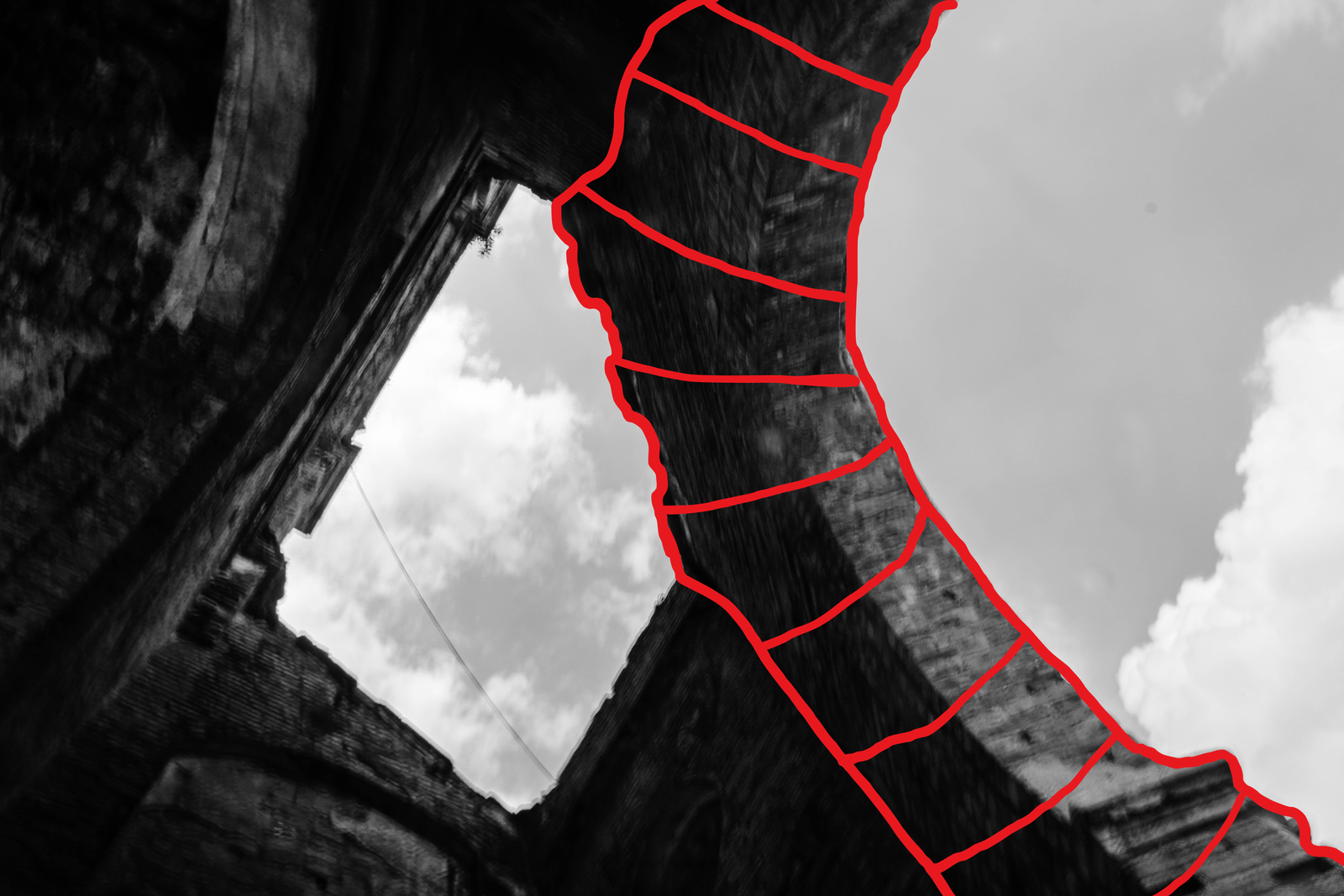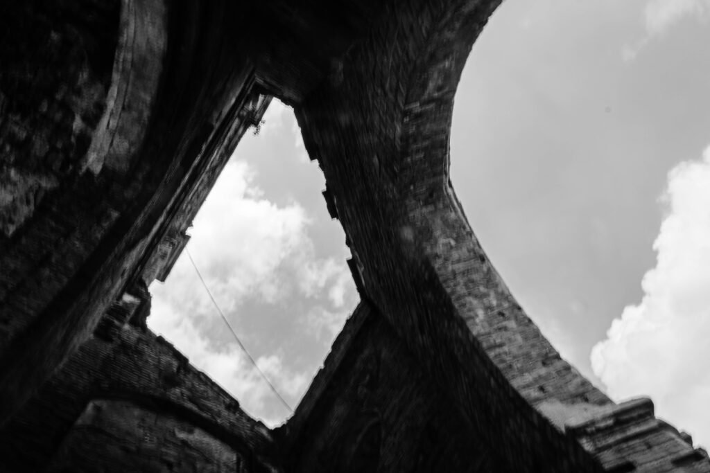 Standing amid the ruins, the boundary between real and unreal, between what remains and what is lost, blurs. Faith - Roman Catholicism, too, turns precarious and elusive, much like the streaks of light and shadow dissolving into one another.