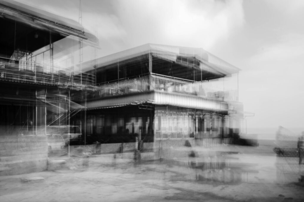 The image shows a sleek new restaurant sprouting next to the fallen church, rendered in a soft blur. The building appears as a “ghost of the present,” suggesting that today’s bustling commerce is just as fleeting as the very relic it leans on.