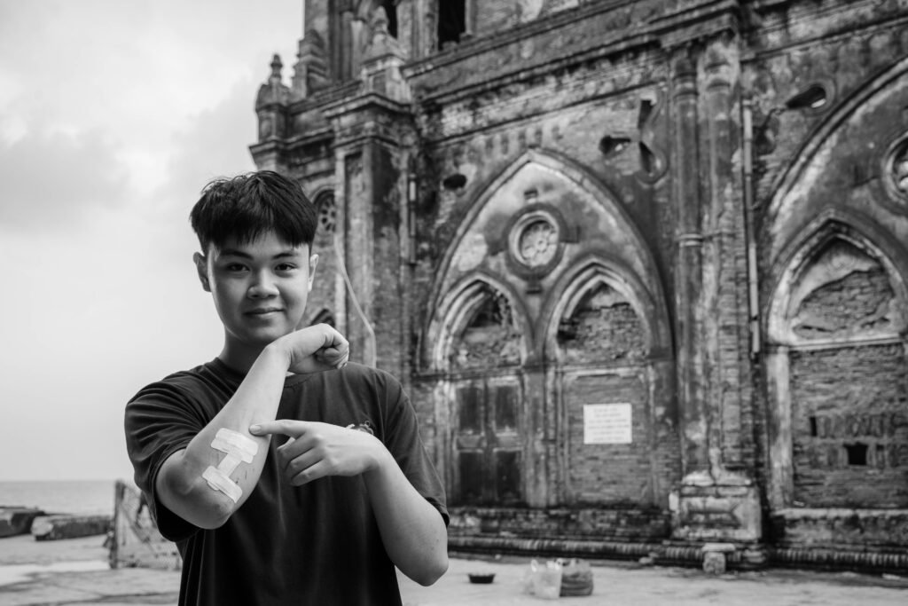 This was once a bustling fishing village. The fury of the waves swept everything away. Only the church remains, a tattered “ghost.” This photograph, with its blurred streaks, reads like a last attempt to hold on to a dissolving image of Xuong Dien Parish.