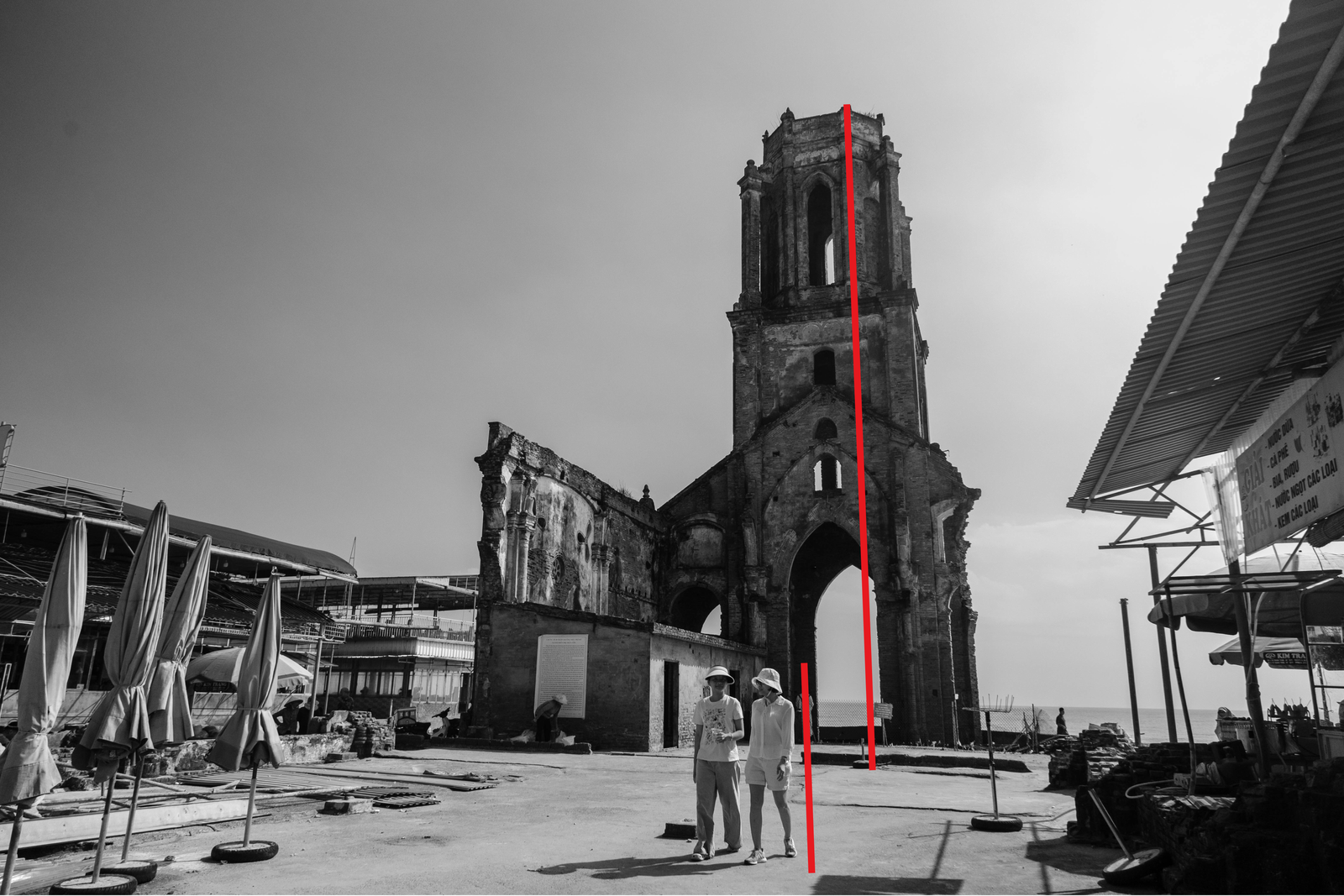 Through the windows of the past, the present comes into view - bustling stalls and umbrellas everywhere. The ruins of the church now share their space with the rhythm of daily livelihood, where visitors pause to rest beside a fading witness to history.
