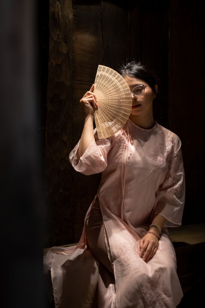 Vietnam Museum of Ethnology, Hanoi. A narrow beam of light finds my best friend Banh in a blush áo dài. The fan becomes a veil. The wood behind her is a stage. Tradition speaks softly, and you lean in to hear it.
